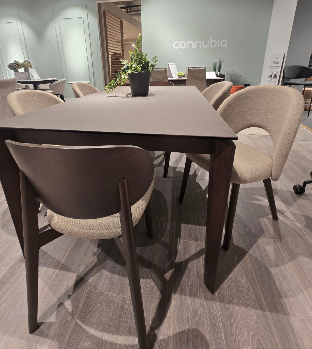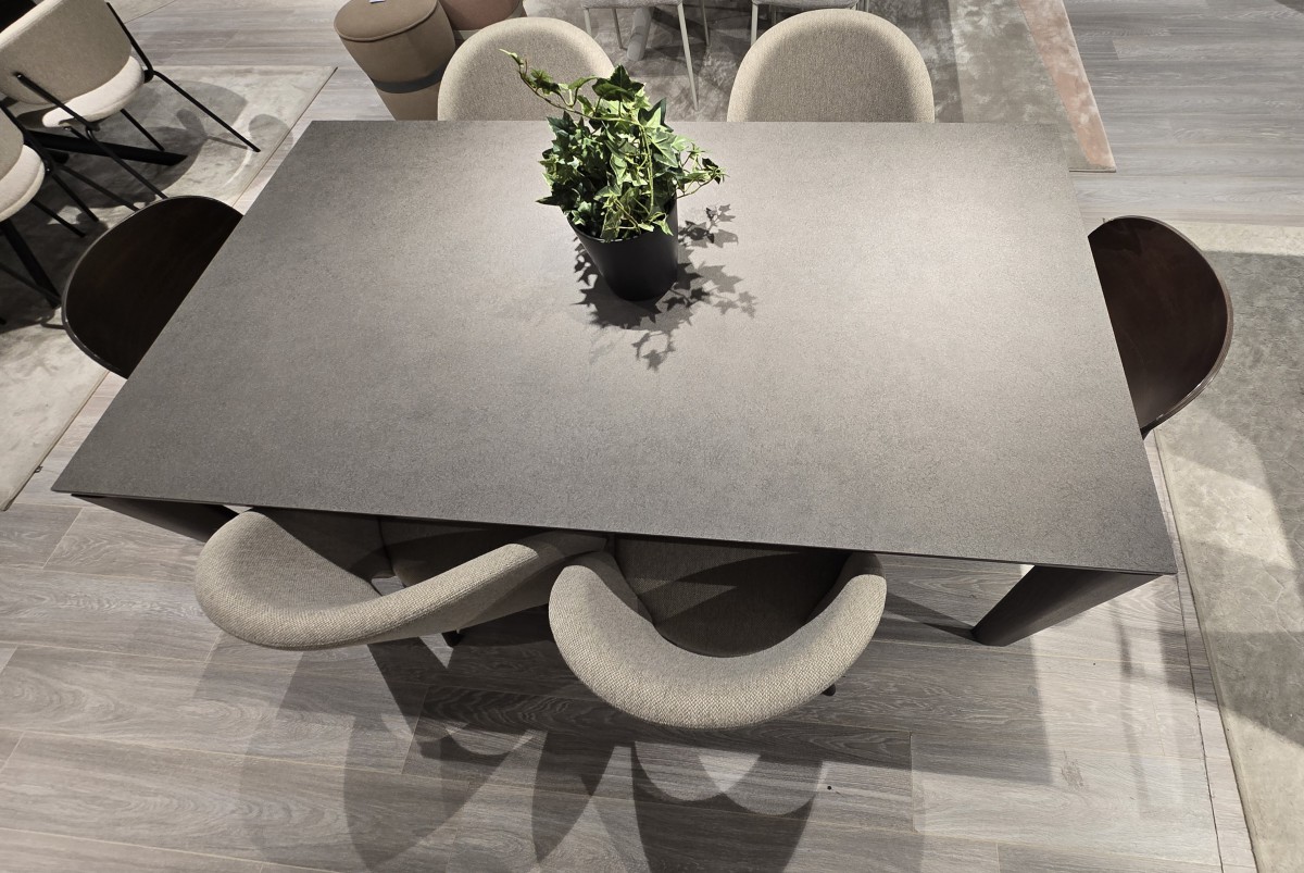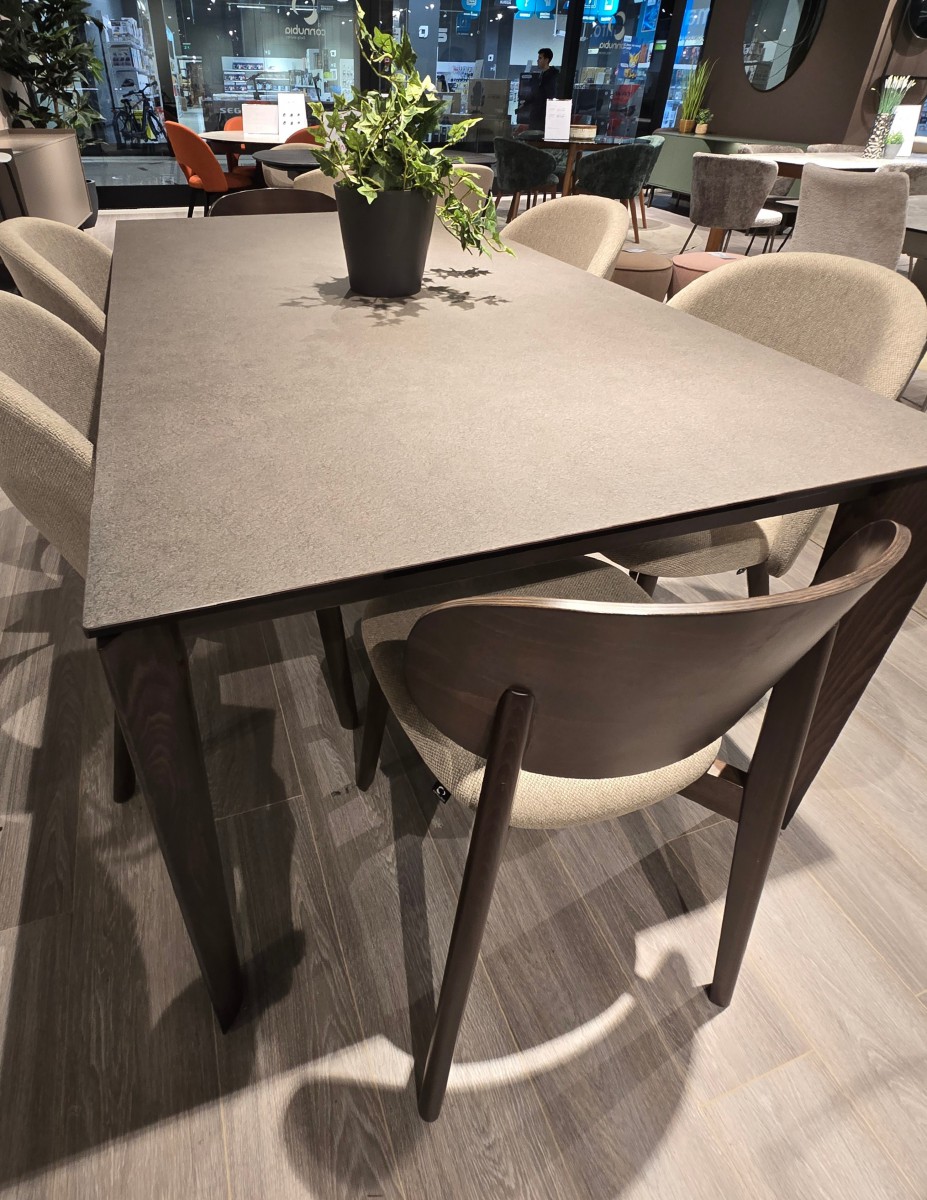 Stol BAND Connubia s drvenom wenge bojom noge i keramičkom pločom, dimenzija 180/240 x 100 H76 cm, prodaje se kao izložbeni primjerak u setu s 4 stolice TUKA u bež tkanini i 2 drvene stolice EIDE. Izražena cijena je za set stol + 6 stolica i odnosi se na izložbene primjerke.